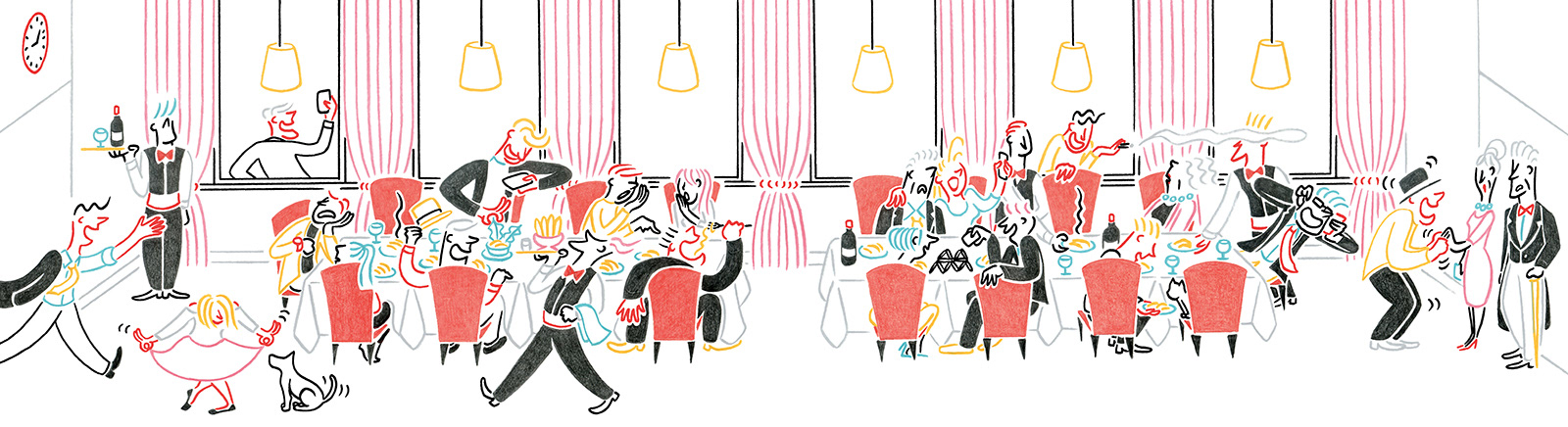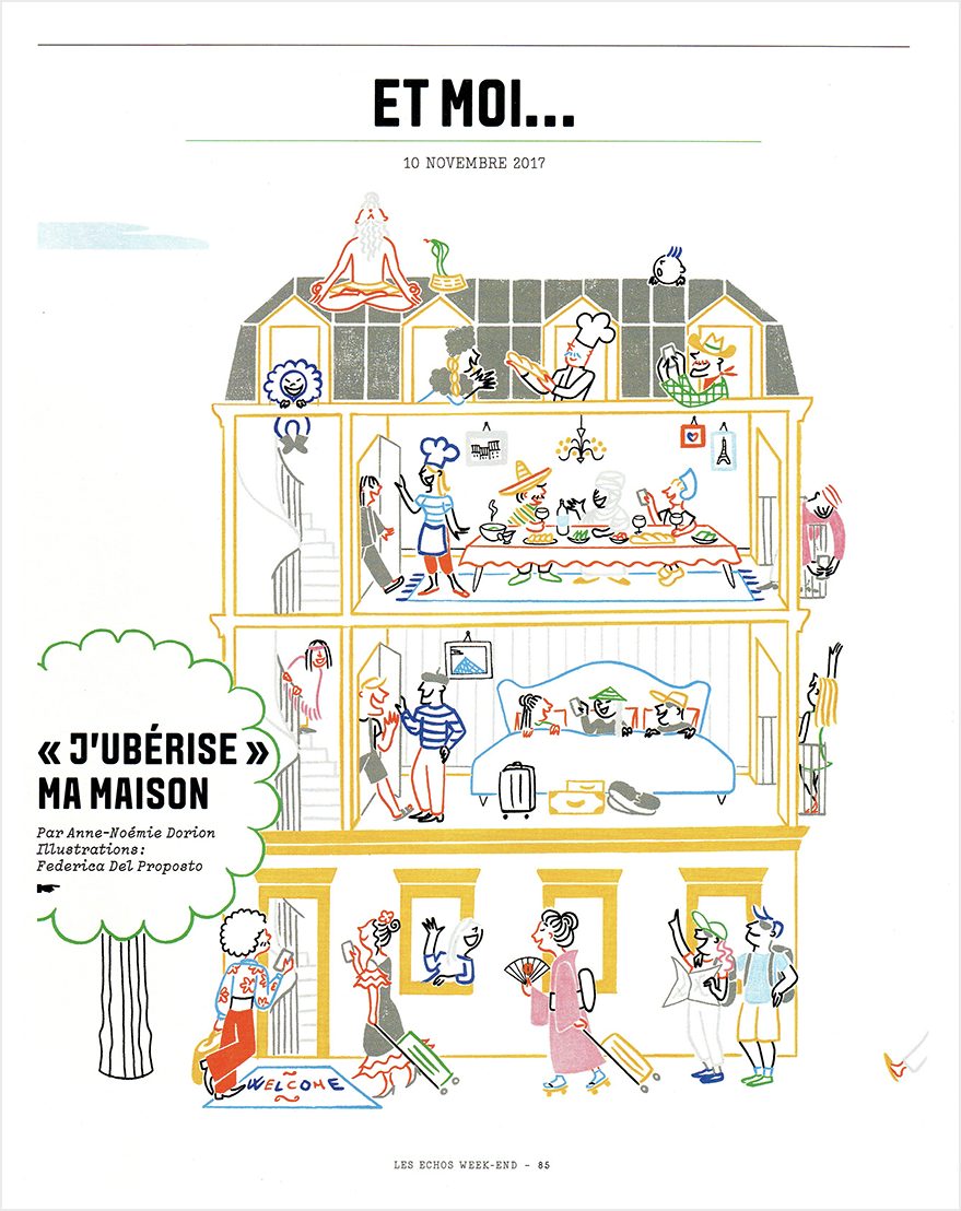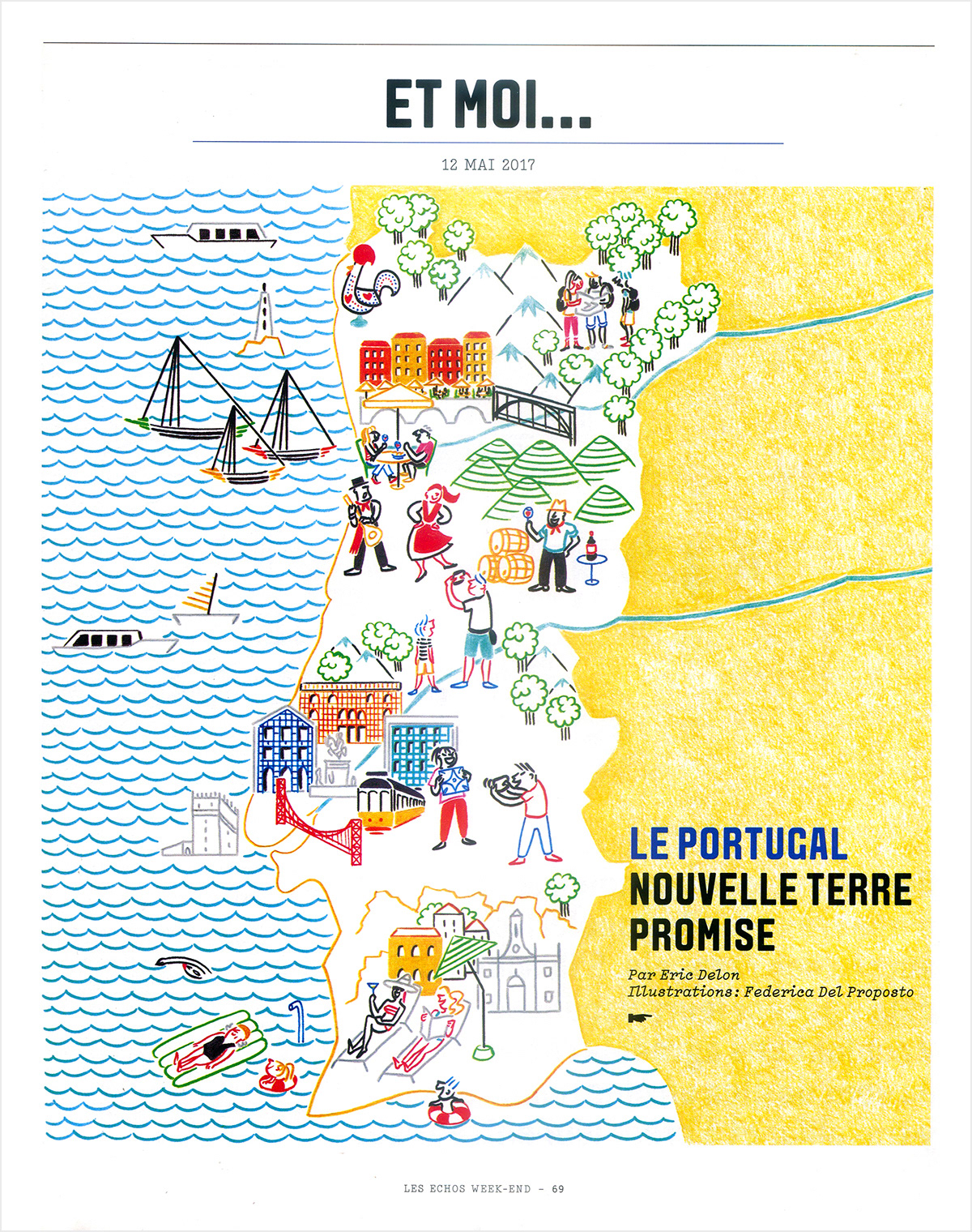 editorial illustration series for Les Echos Série Limitée and Les Echos Week-End, column Et moi, section opener, double spread