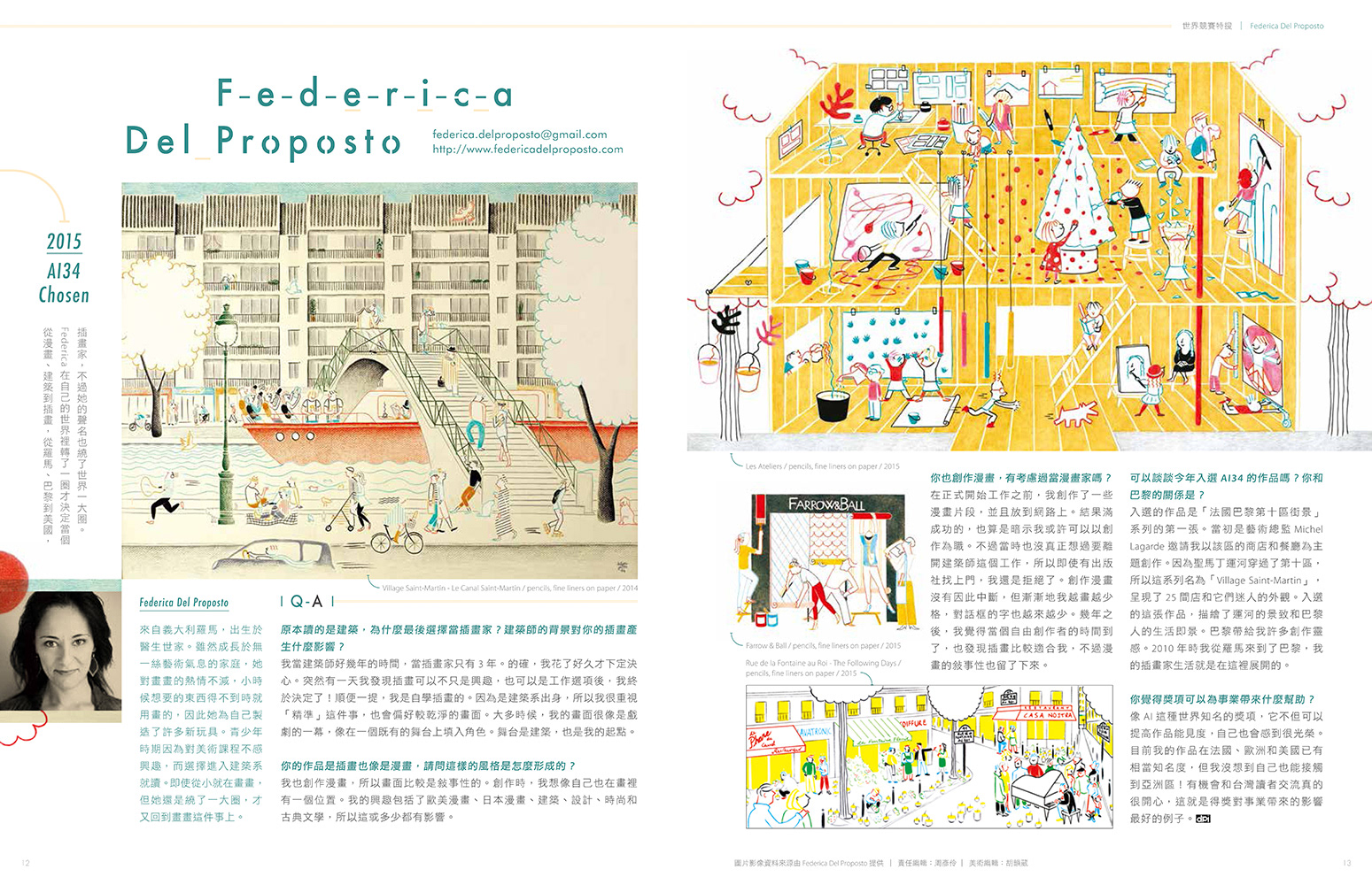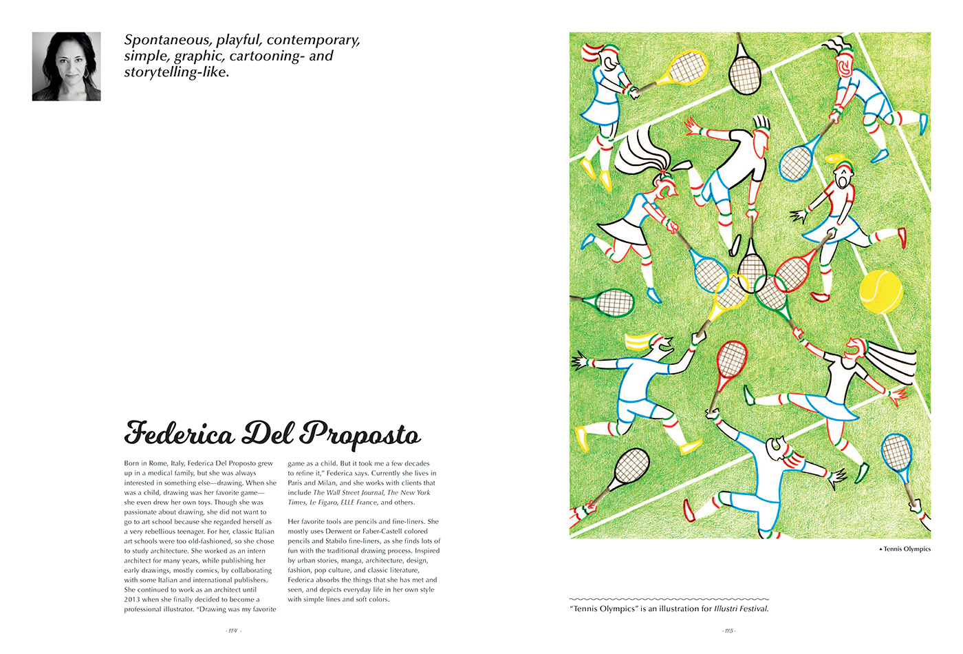 “Spontaneus, playful, contemporary, simple, graphic, cartooning- and storytelling-like. Federica Del Proposto”, Kaleidoscope - The Art of Illustrative Storytelling, Sandu Publishing, 2018, China